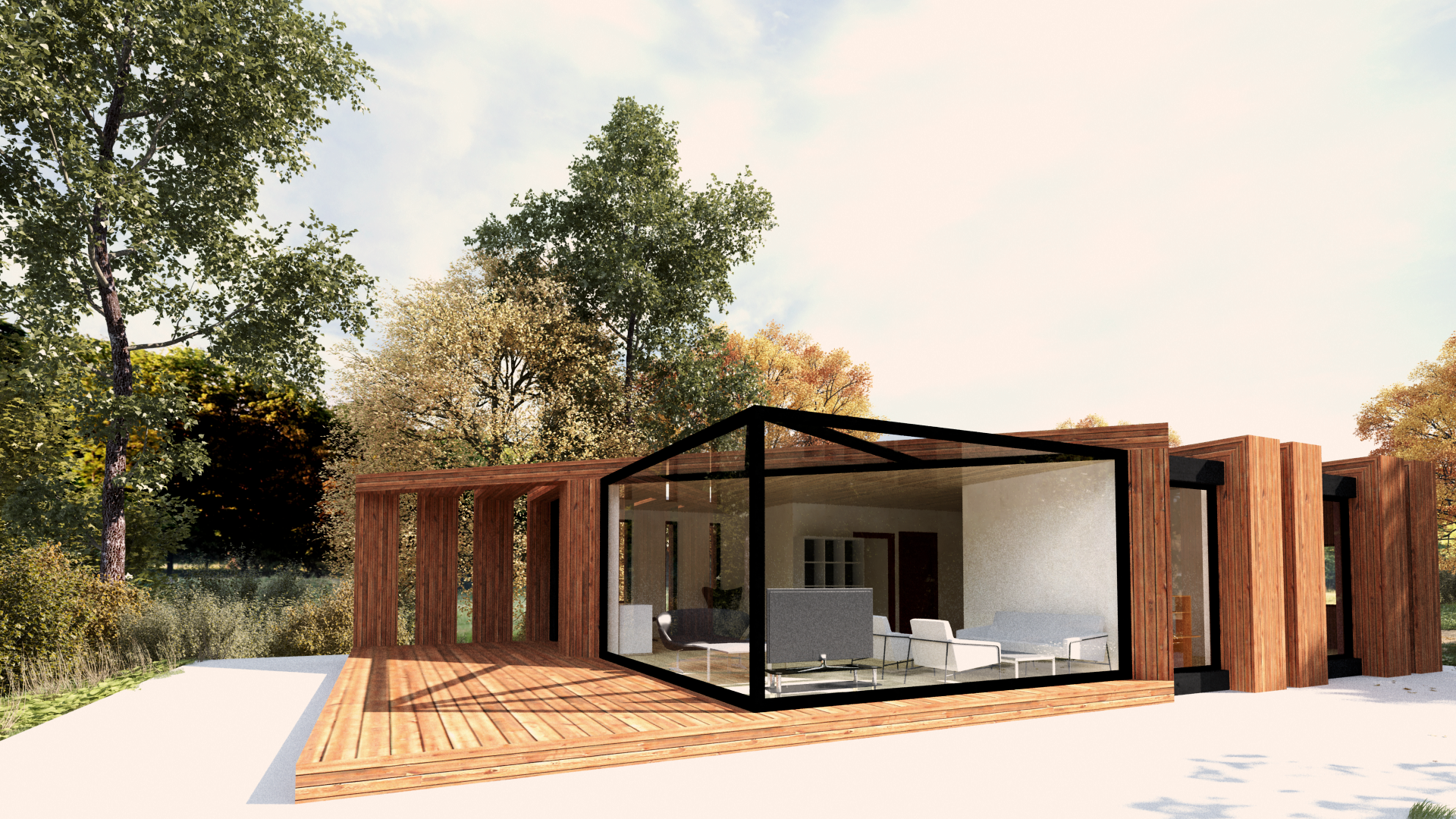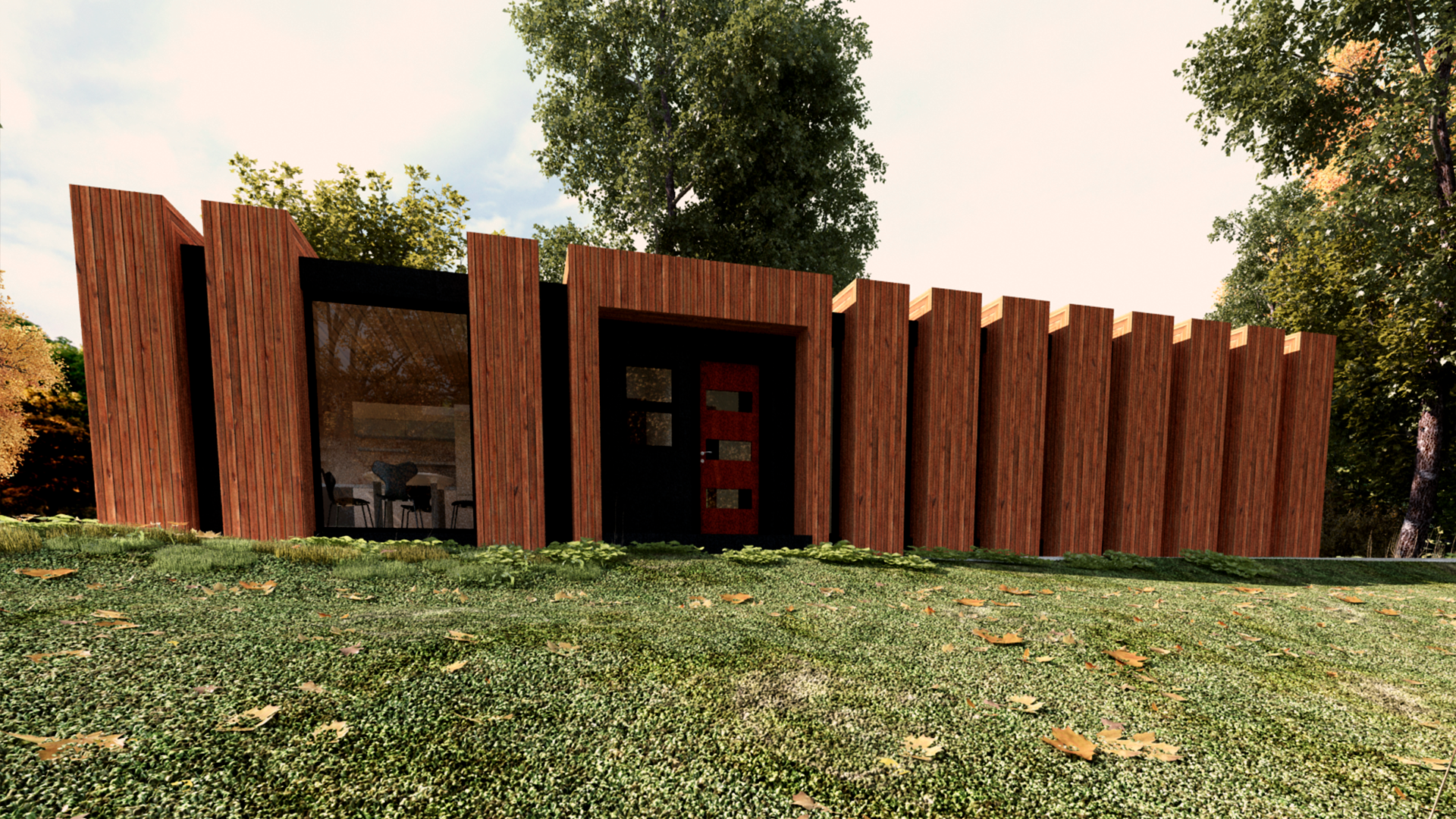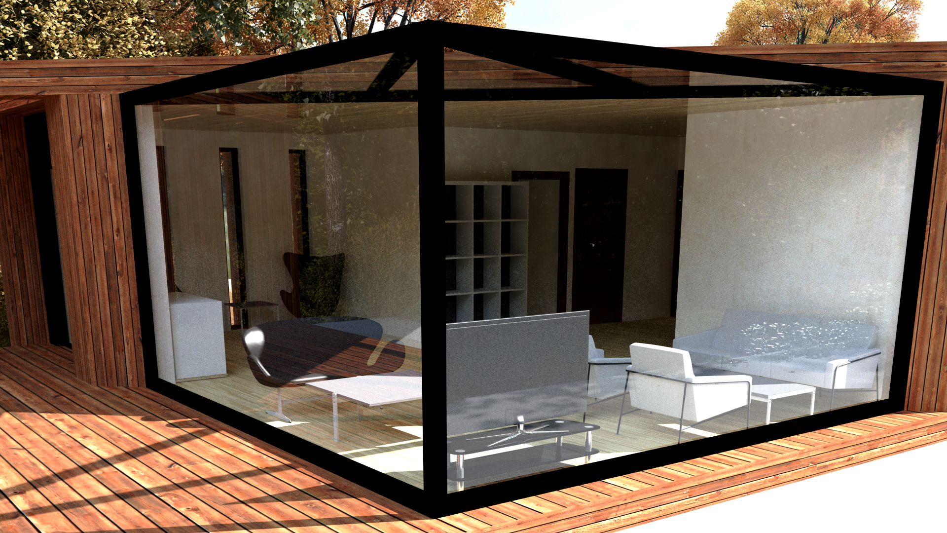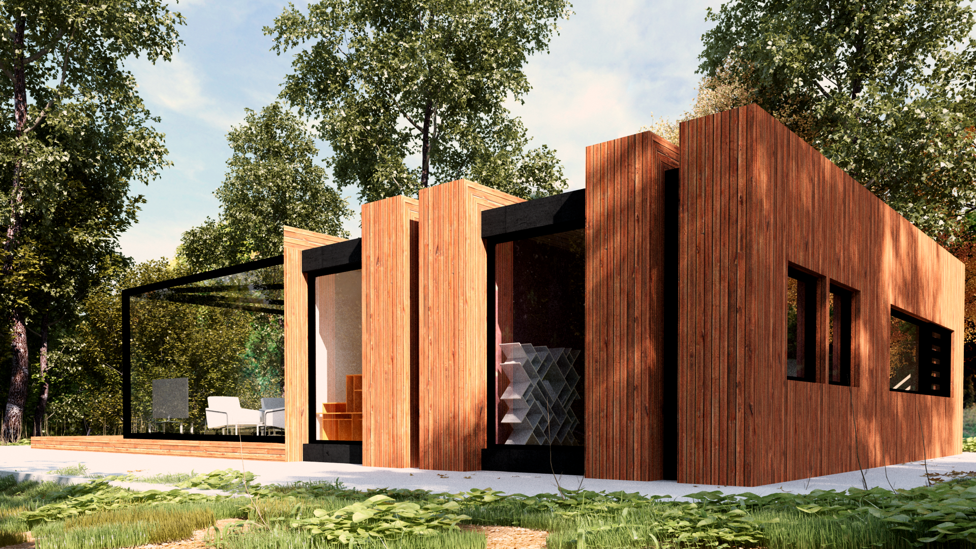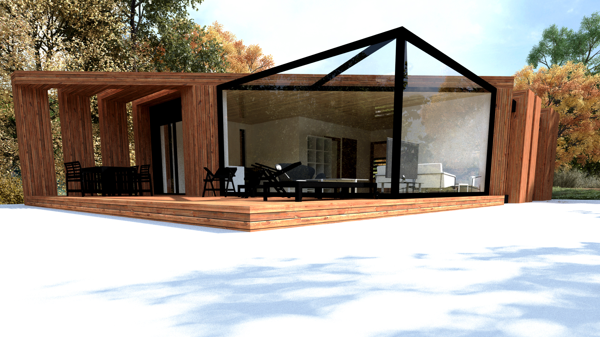 The cottage in the forest is a concept that incorporates modern aesthetics into the popular Danish trend, “the summer house”. The design is very much inspired by the more recent expression of using squared shapes. This is especially also in conjunction with the more open design with large windows to better experience nature and the great view outside. Additionally, we also aimed for duality in the material choice by using both wood and concrete to further build on the idea of having a modern house in nature.