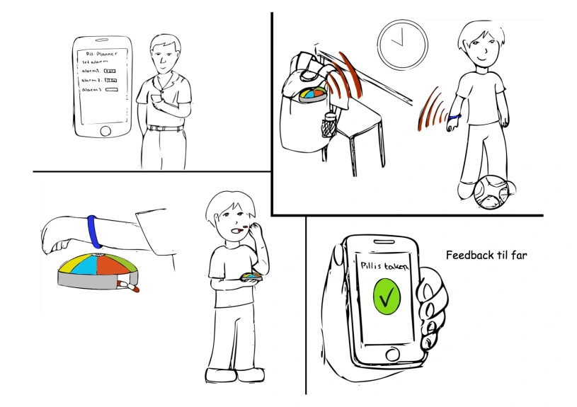 The concept consists of two devices, a pill dispenser and a bracelet, plus a website. The parents can set up the device online, where they can set alarms for when the child should take their medication. When the bracelet vibrates, the child will get reminded to take the medication. The pills get dispensed by scanning the bracelet close to the dispenser, which will also notify the parents that the child has taken the medicine. For the full details, please watch the Kickstarter-style video below.